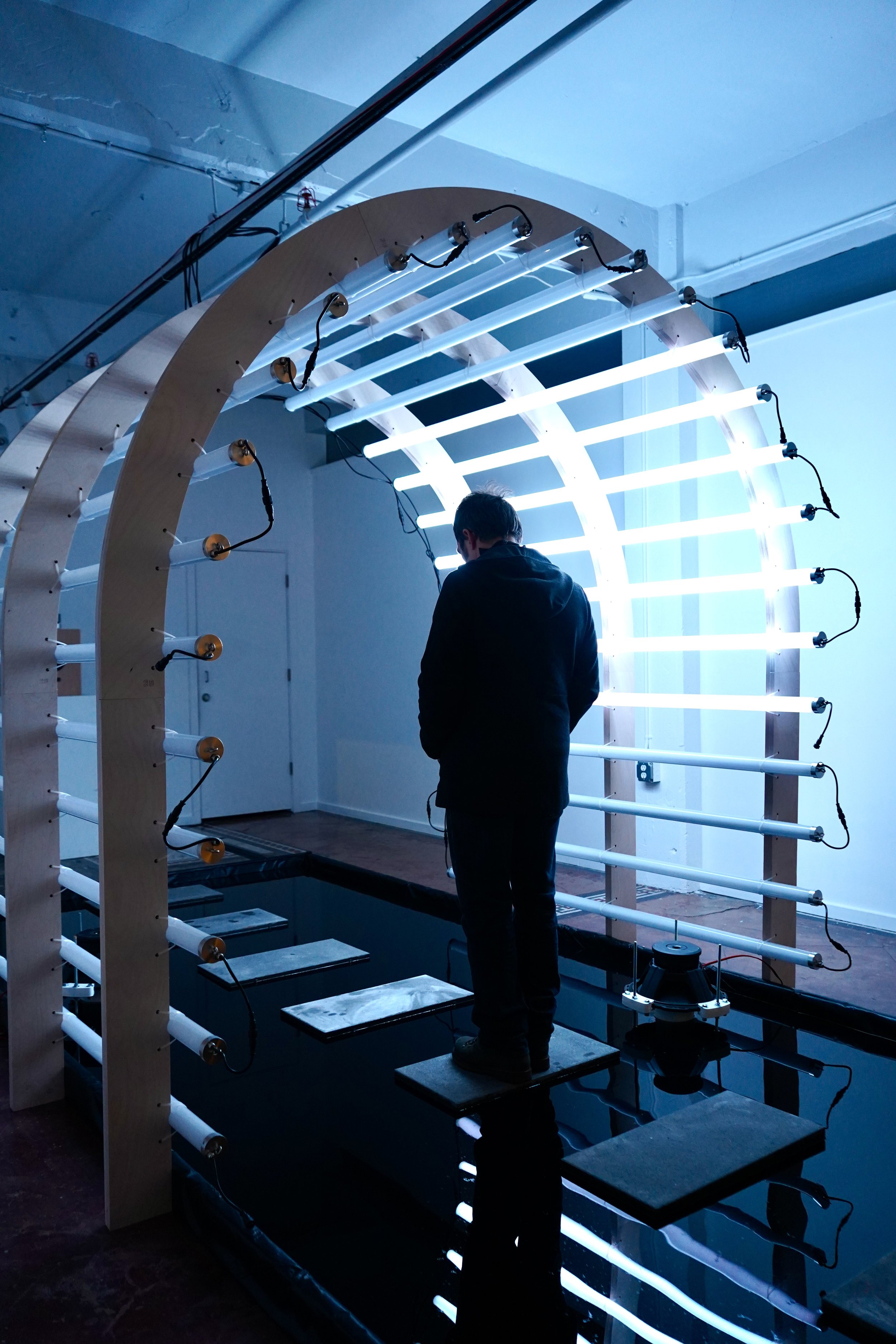 Four independently wired speakers line the pool, each with a 3D-printed plunger ready to fracture the still surface of the water.